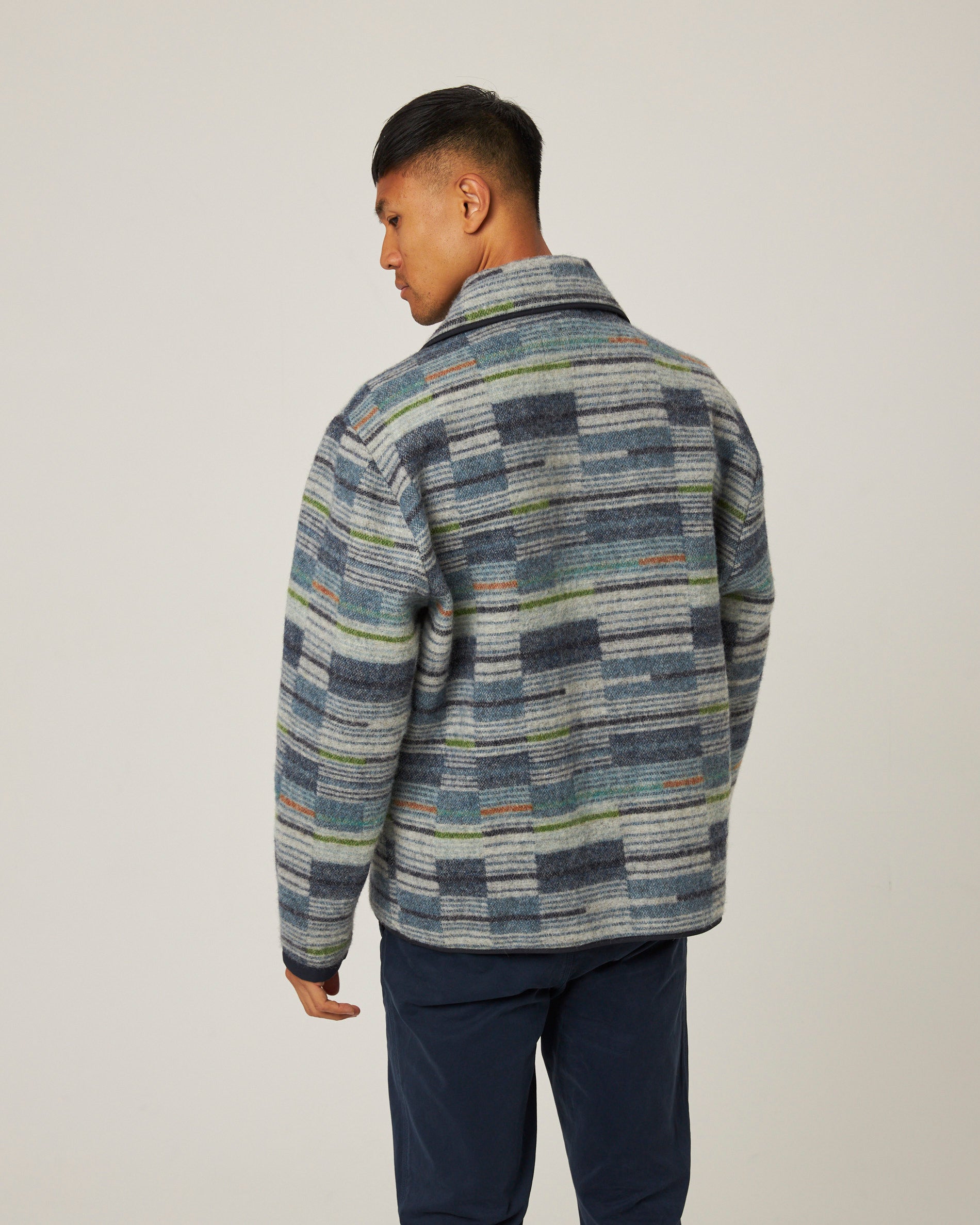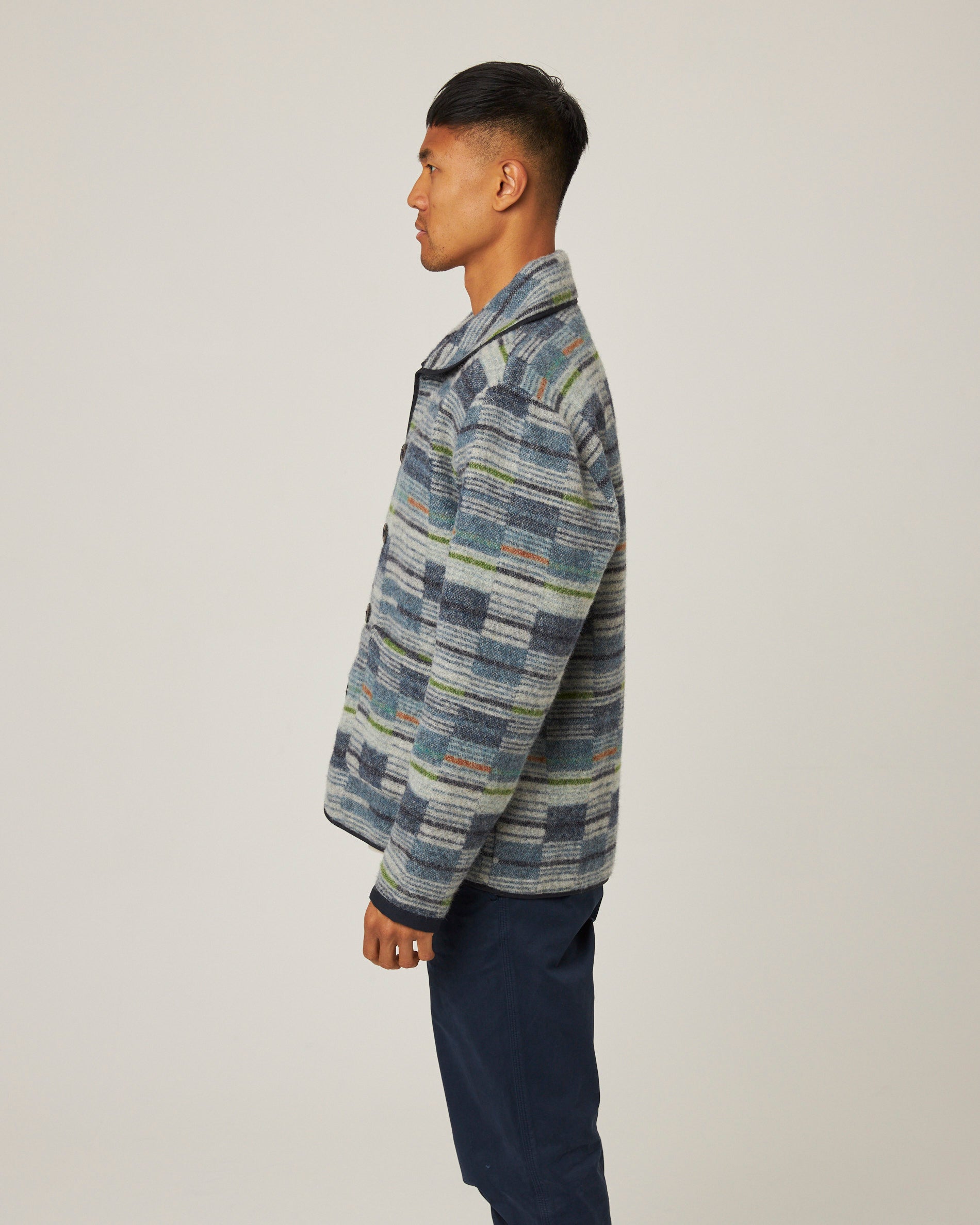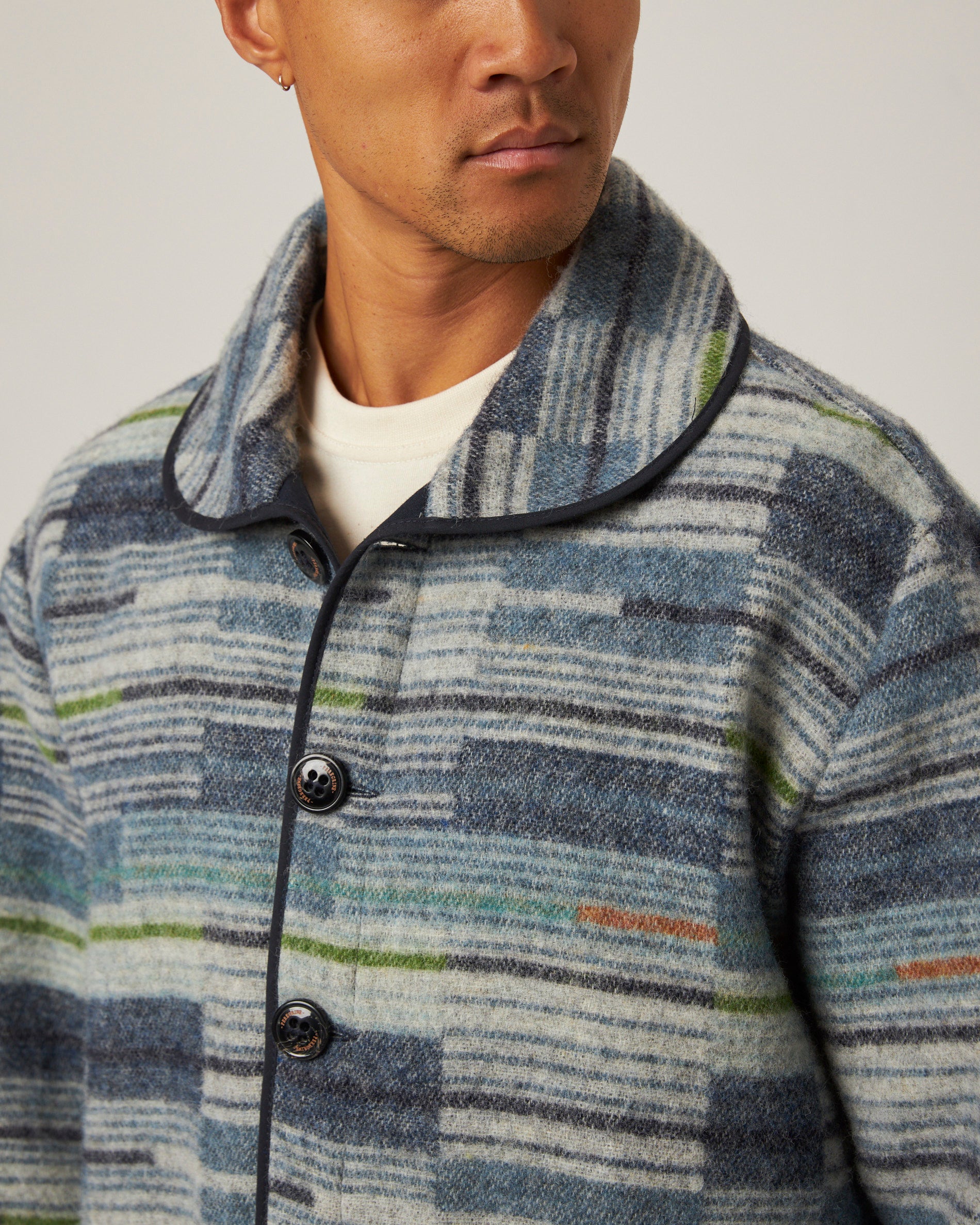 This men's shacket features a relaxed fit and a unique shawl collar, perfect for layering with your favorite winter outfits. Similar to our wool overshirt, it's crafted from classic tweed, traditionally woven at Abraham Moon, one of the oldest wool mills in the UK. This versatile and stylish wool shacket adds dimension and warmth to your winter wardrobe.
