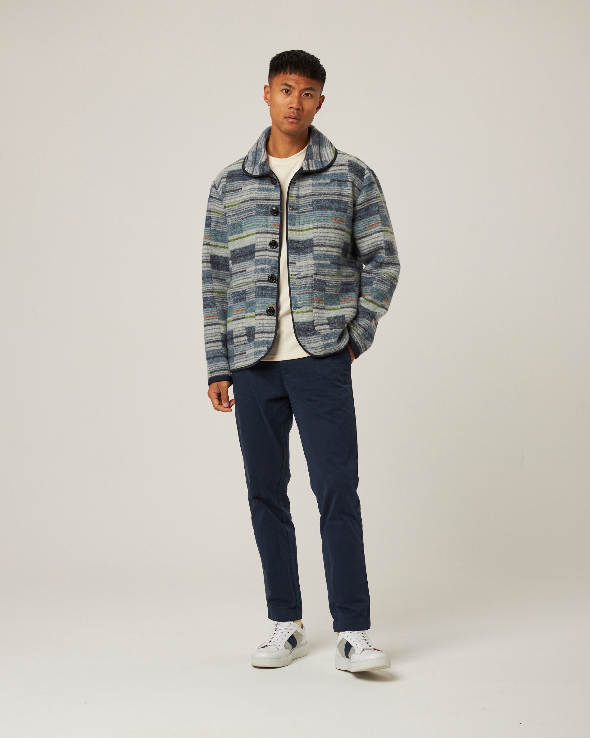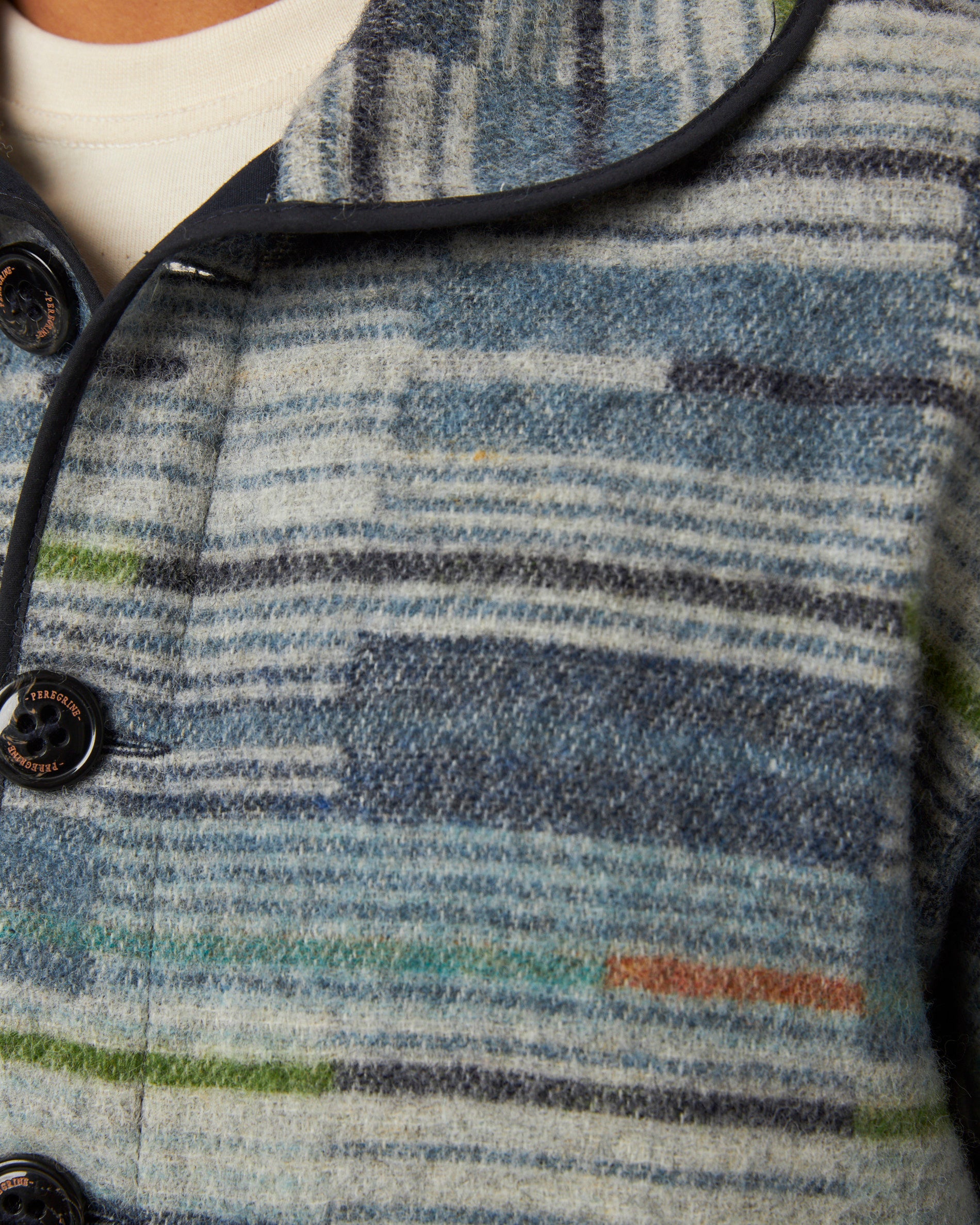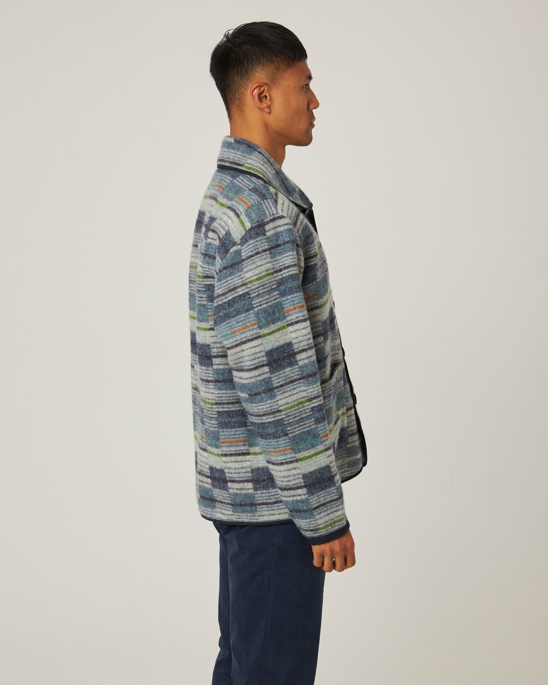 This men's shacket features a relaxed fit and a unique shawl collar, perfect for layering with your favorite winter outfits. Similar to our wool overshirt, it's crafted from classic tweed, traditionally woven at Abraham Moon, one of the oldest wool mills in the UK. This versatile and stylish wool shacket adds dimension and warmth to your winter wardrobe.