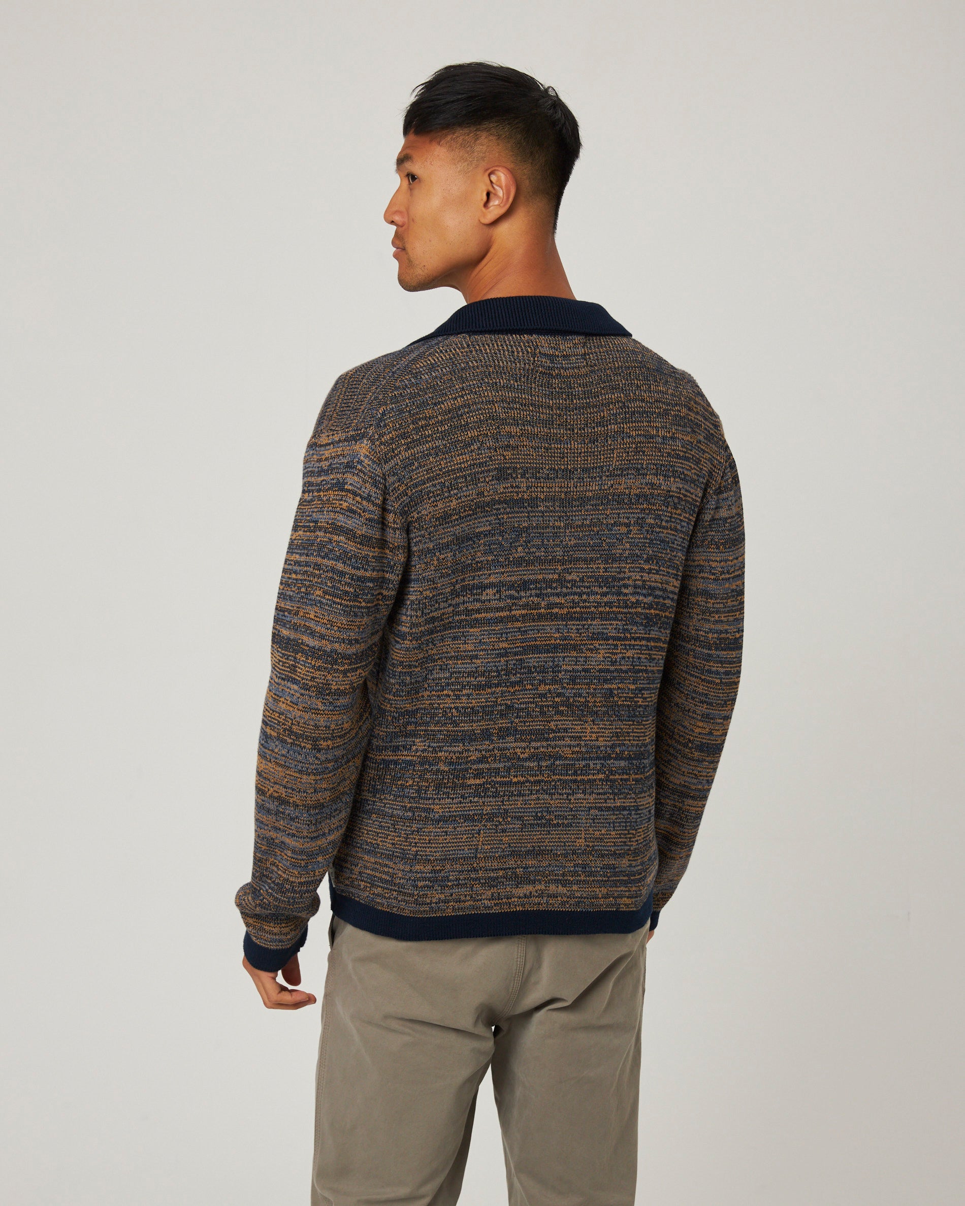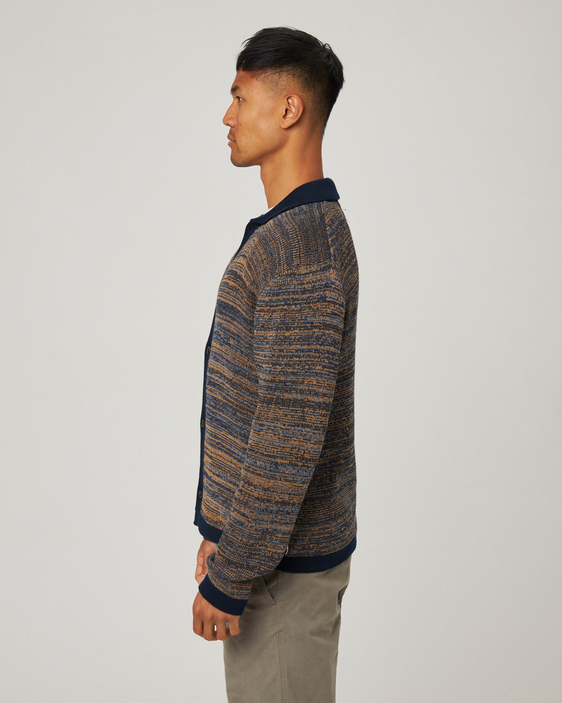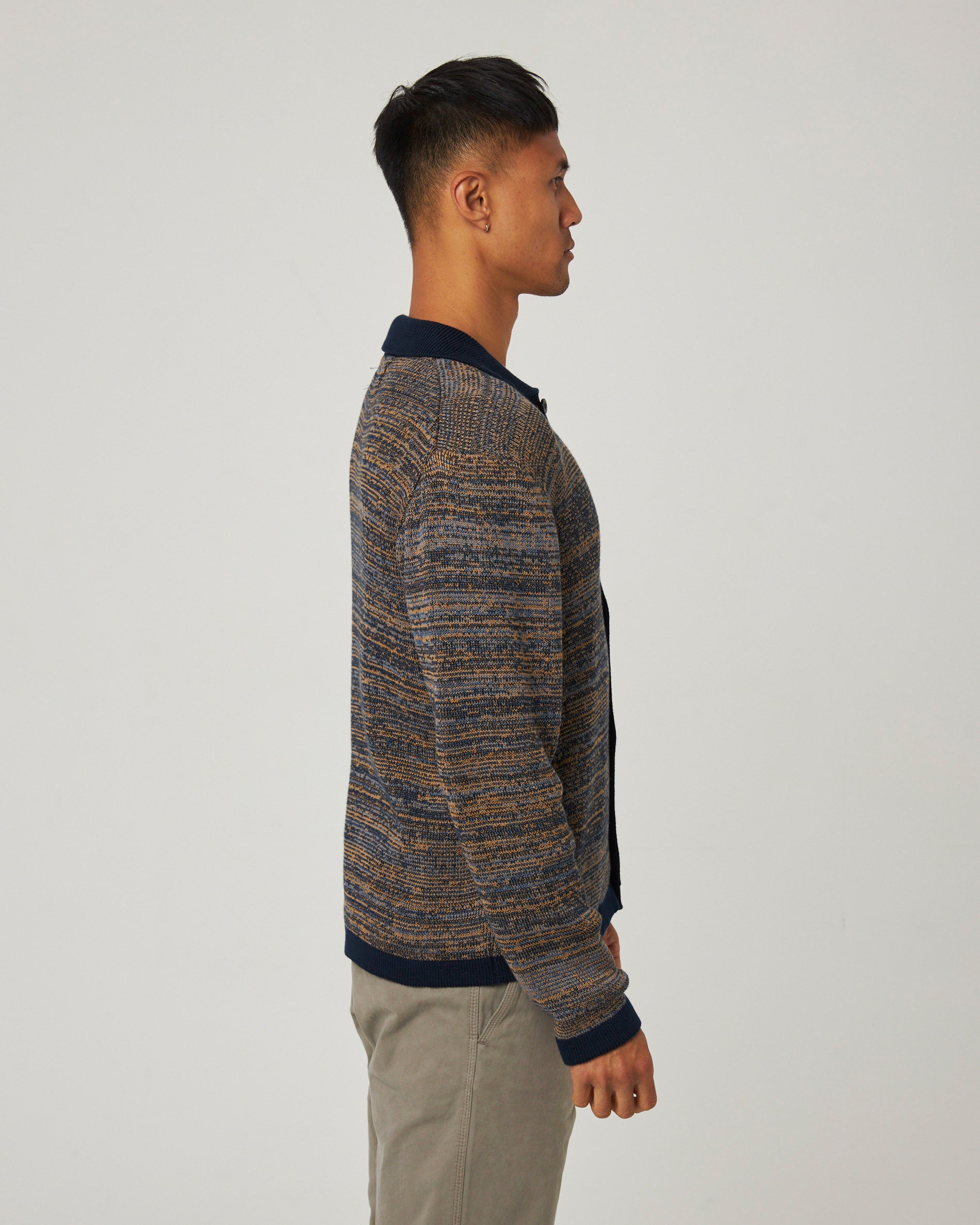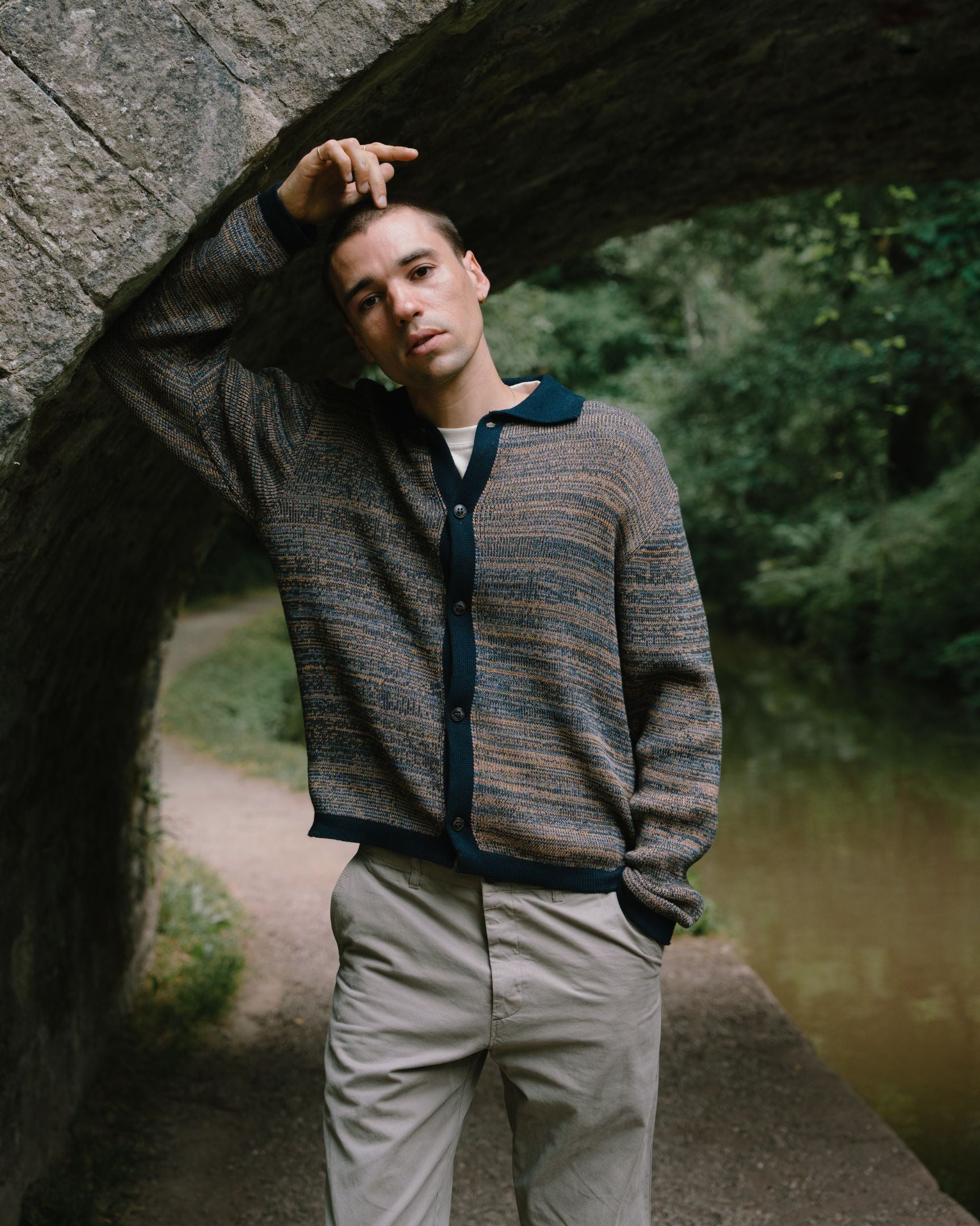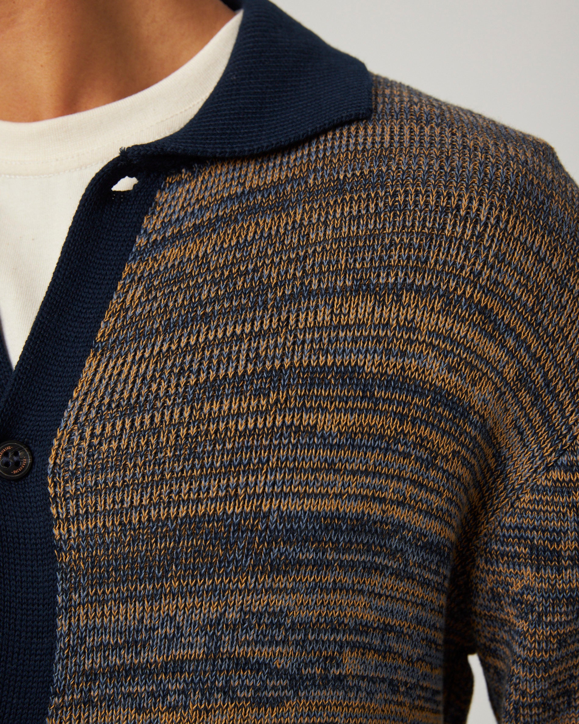 A knitted shirt for transitioning through the seasons. Made from 100% cotton, this button-through shirt provides a smart-casual flowing appearance with intricate knitted details woven into its block colour. Finished with navy trimmings, this knitted piece is eye-catching with a timeless finish.