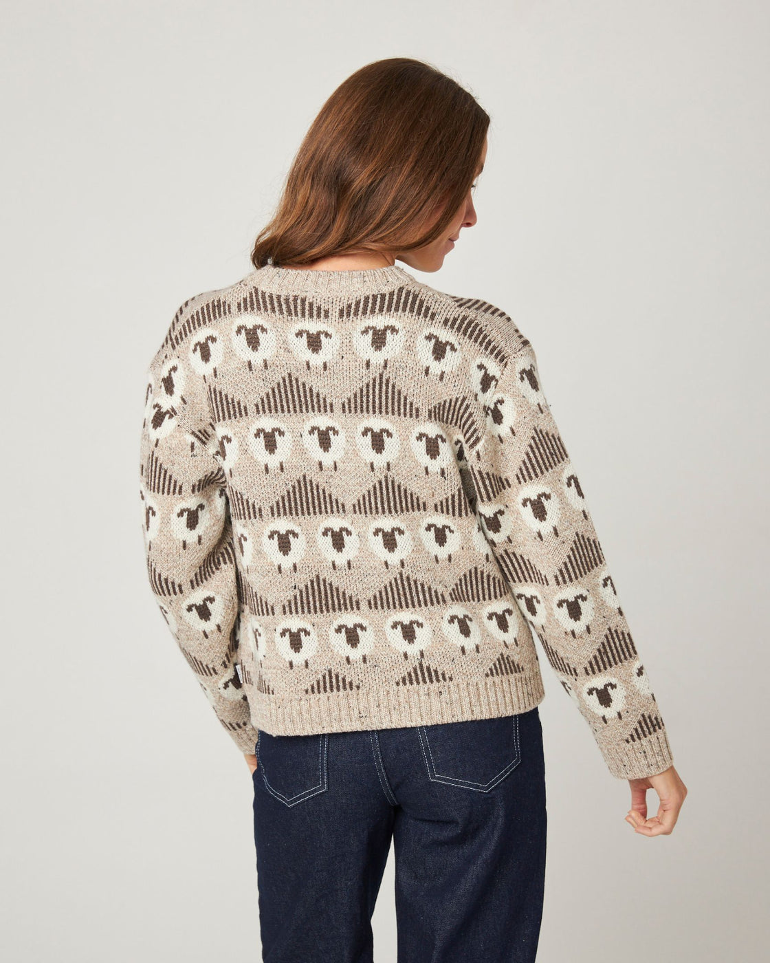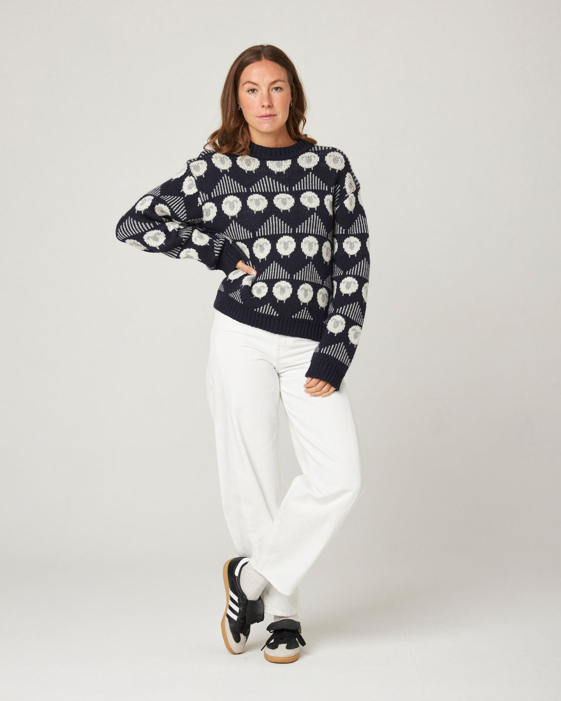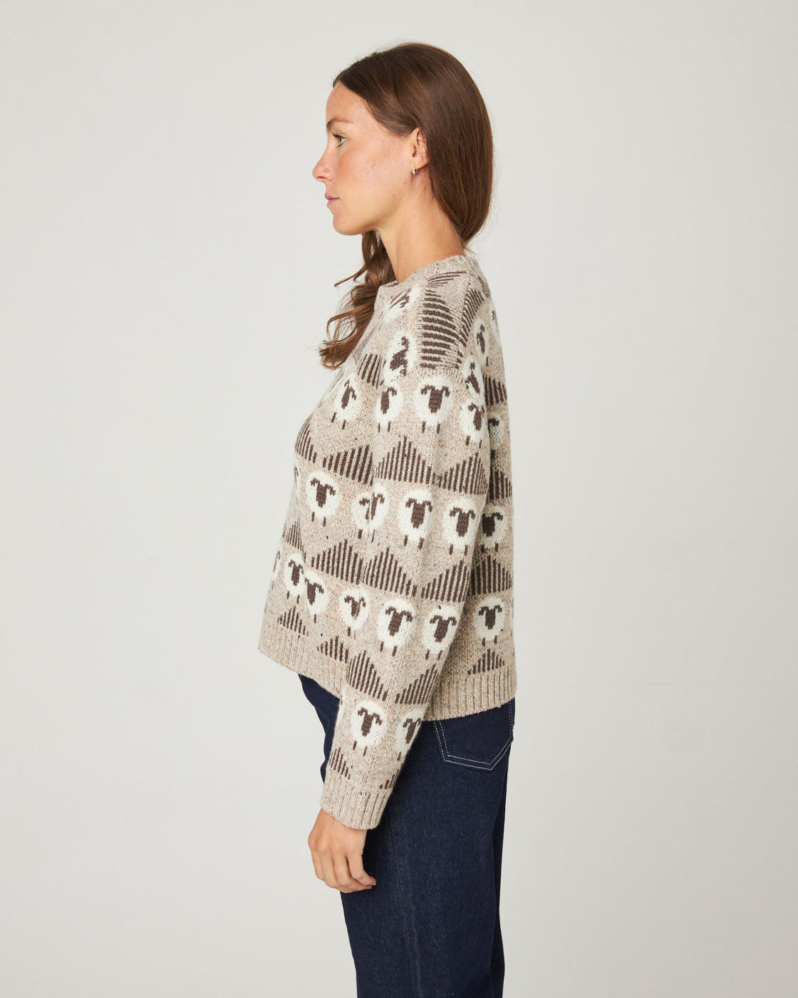 A merino wool jumper with a classic crew neck and cute sheep design. This midweight knitted jumper is made from 100% merino wool to provide warmth and comfort for you winter outings. As with all our knitwear, the Megan Sheep Jumper was made in our own factory in Manchester, England.